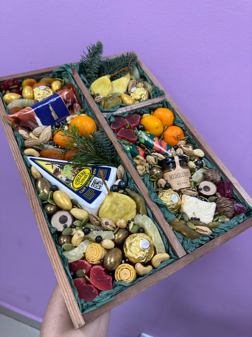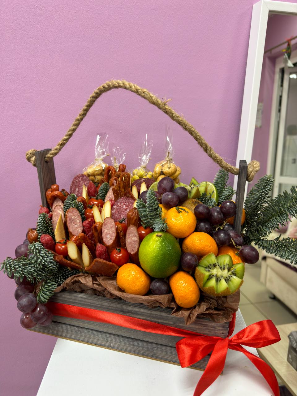 Деревянный ящик с крабом волосатиком ,конечностями краба стригуна и креветками.Стильный букет для ценителей и любителей морепродуктов, подойдет на подарок тому у кого всё есть и вы не знаете, что ему подарить.